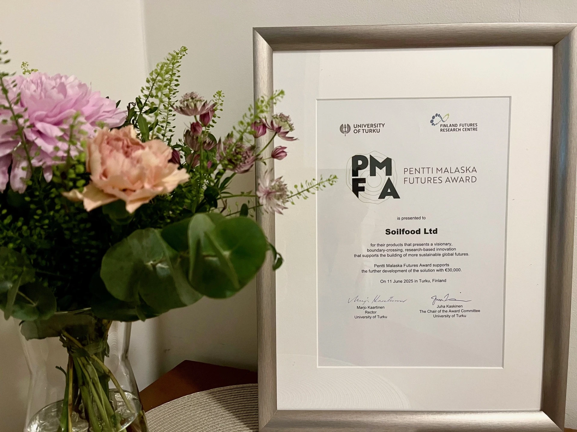 The Pentti Malaska Futures Award is given to a research-based and groundbreaking visionary innovation that can help with building a more sustainable global future. The University of Turku has granted the €30,000 Pentti Malaska Futures Award to Soilfood Ltd for their solution that connects industry and agriculture into a functioning circular economy.